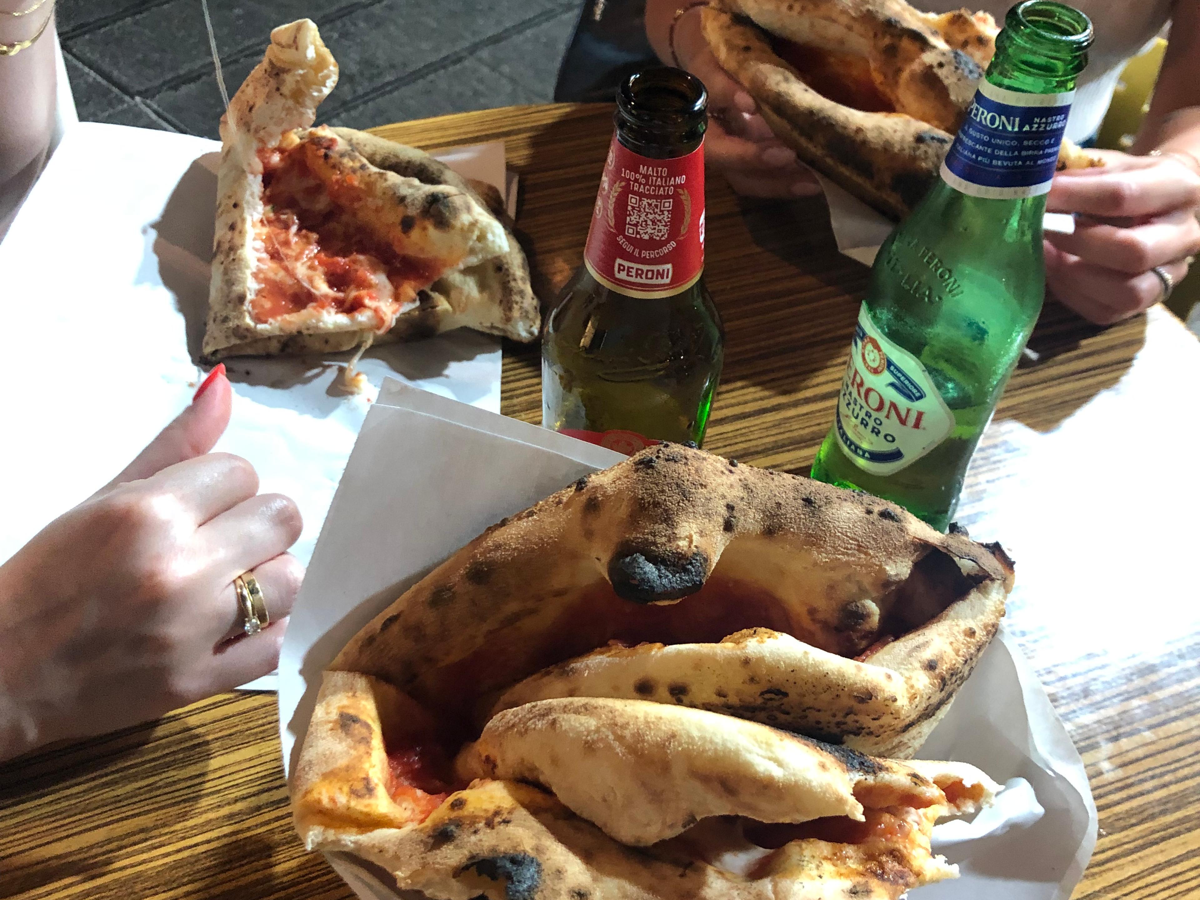 Jednym z kulinarnych fenomenów Neapolu jest dla mnie Pizza a Portafoglio. Jest to margherita złożona na 4 części, jak kanapka i serwowana na wynos, najczęściej z małych, street foodowych lokali. Znajdziesz je m.in. na Via Toledo (np. w Michele Tutino lub Sorbillo Piccolina). Cena: 2,5 €.