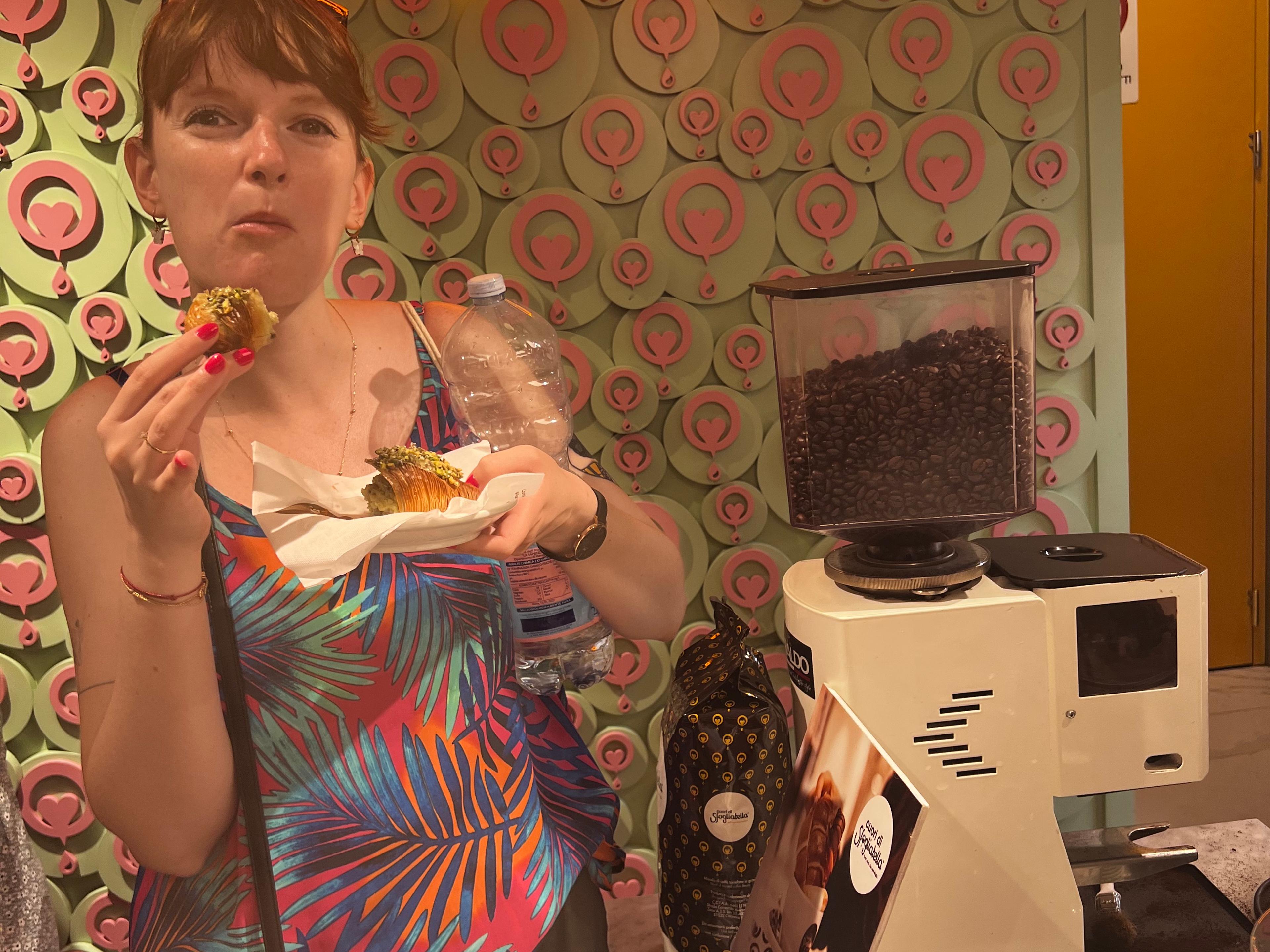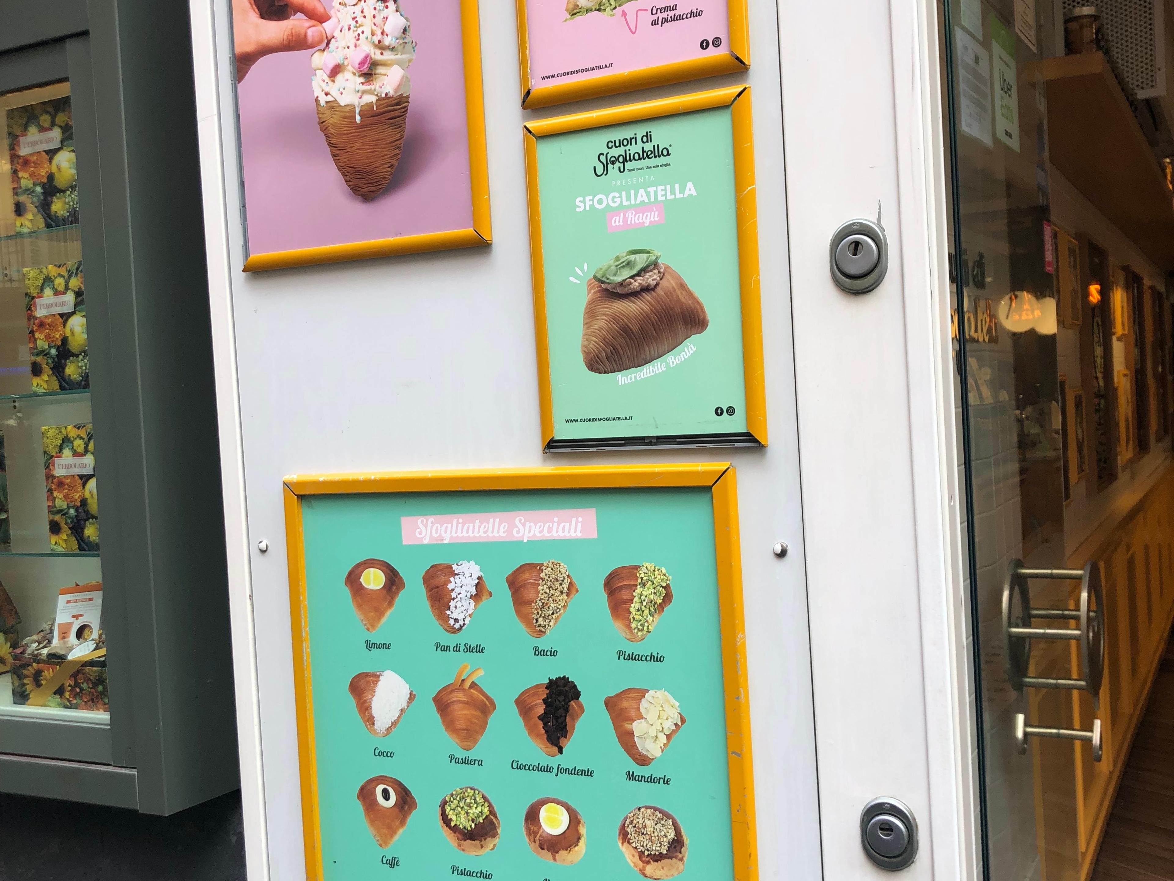 Zachęcam Was do odwiedzenia Cuori di Sfogliatella, gdzie wypijecie pyszną kawę i zjecie coś na słodko. Lokalnym rarytasem jest Sfogliatella – neapolitański wypiek z ciasta przypominającego filo, z nadzieniem w środku, najczęściej ricottą i pastą migdałową (około 1,2 €). Okrutnie słodkie, ale i ekstremalnie smaczne. Możesz wypić kawę i zjeść przy barze lub usiąść do stolika (+ coperto 1-1,5€).