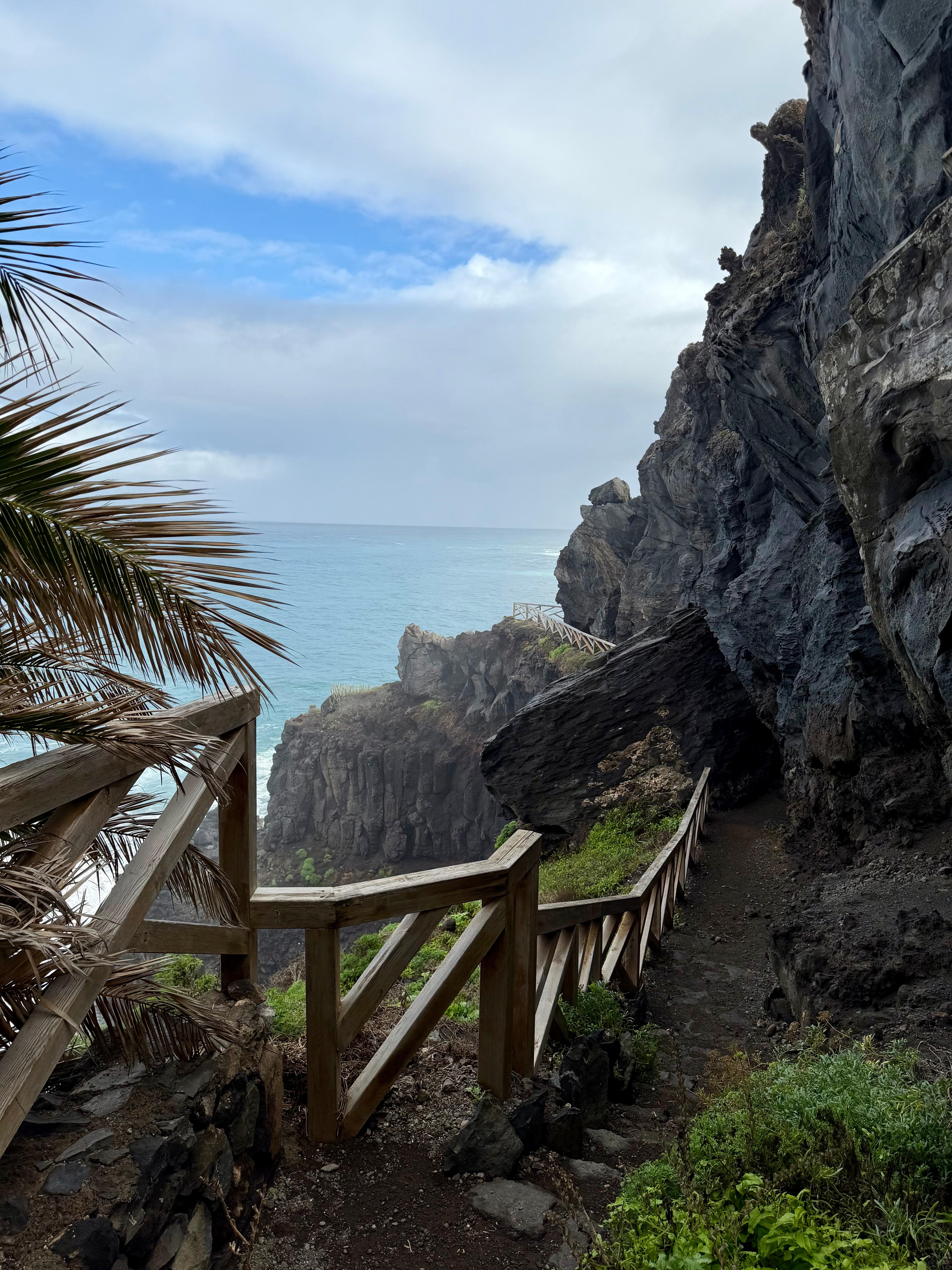 Jeśli tu dotrzesz, bardzo ważna wskazówka: nie schodź od razu. Przejdź dalej schodami prowadzącymi do alejki wzdłuż muru i idź, idź, idź… Będziesz mieć przyjemny spacer wzdłuż oceanu (tylko jakieś kilkaset metrów nad nim), skąd w pewnym momencie zaczniesz zauważać inną, bardziej skalistą część wybrzeża. Dla mnie była to zupełnie nowa perspektywa i żałuję, że odkryłam ją dopiero przy kolejnej wizycie w Puerto.