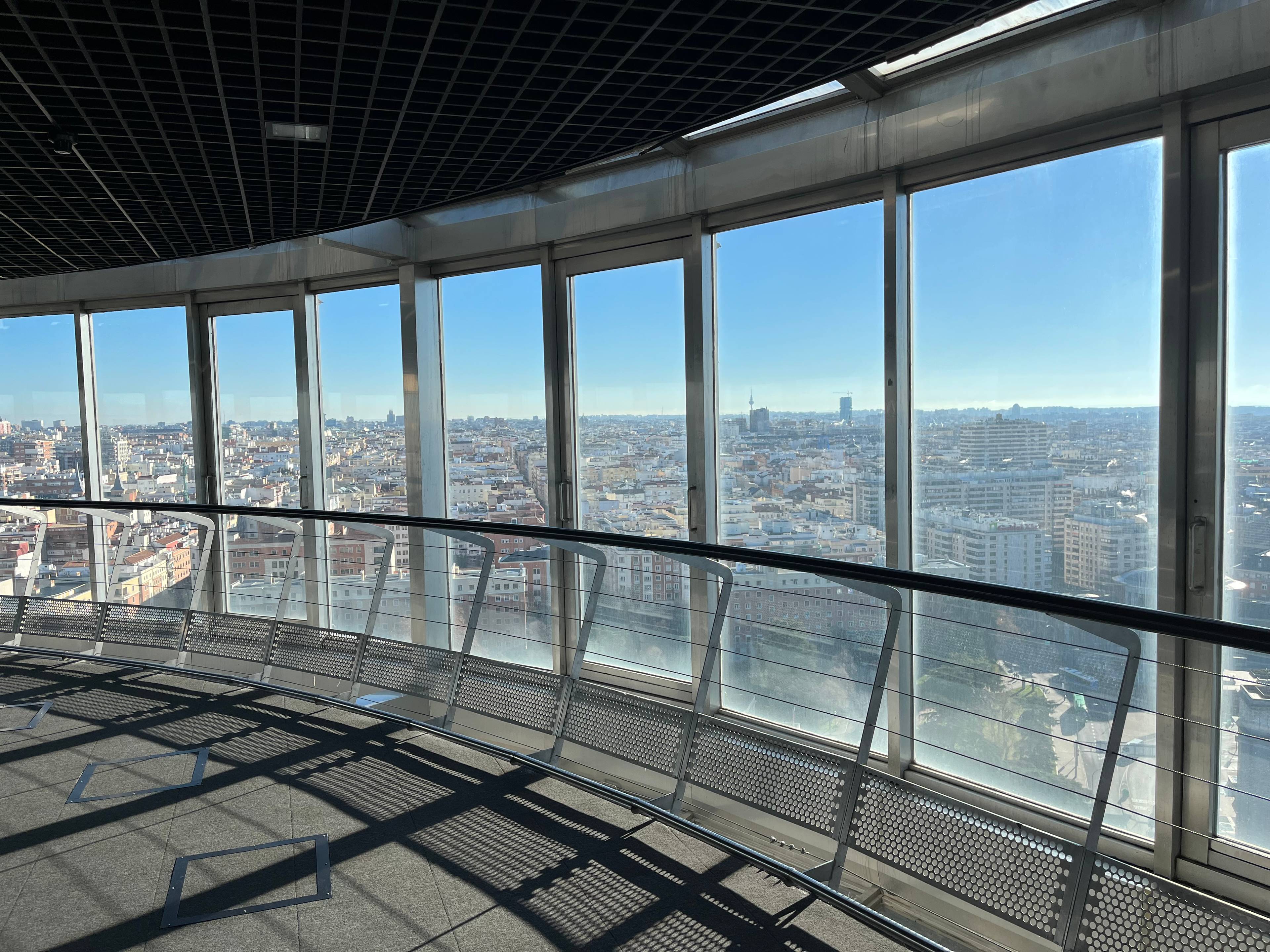 Źródło zdjęcia: miradormadrid.comAby dostać się na punkt widokowy, wejdź do budynku, a następnie skieruj się do kasy, która znajduje się na 2 piętrze. Po zakupie biletu wjedziesz windą na 6 piętro, kolejne 2 pokonasz schodami. (Dla osób z trudnościami w poruszaniu się jest dostępna winda również na tych ostatnich 2 piętrach).