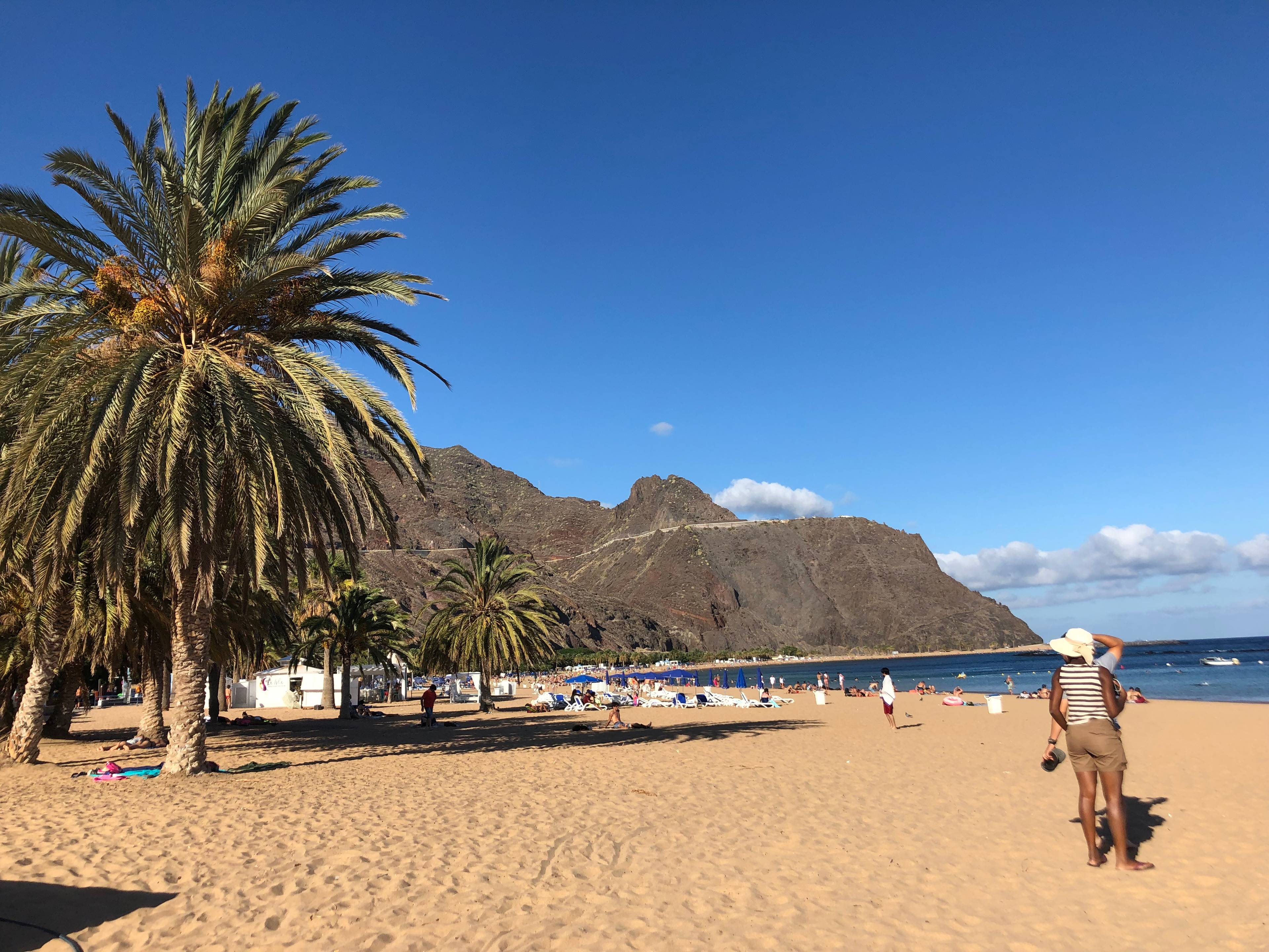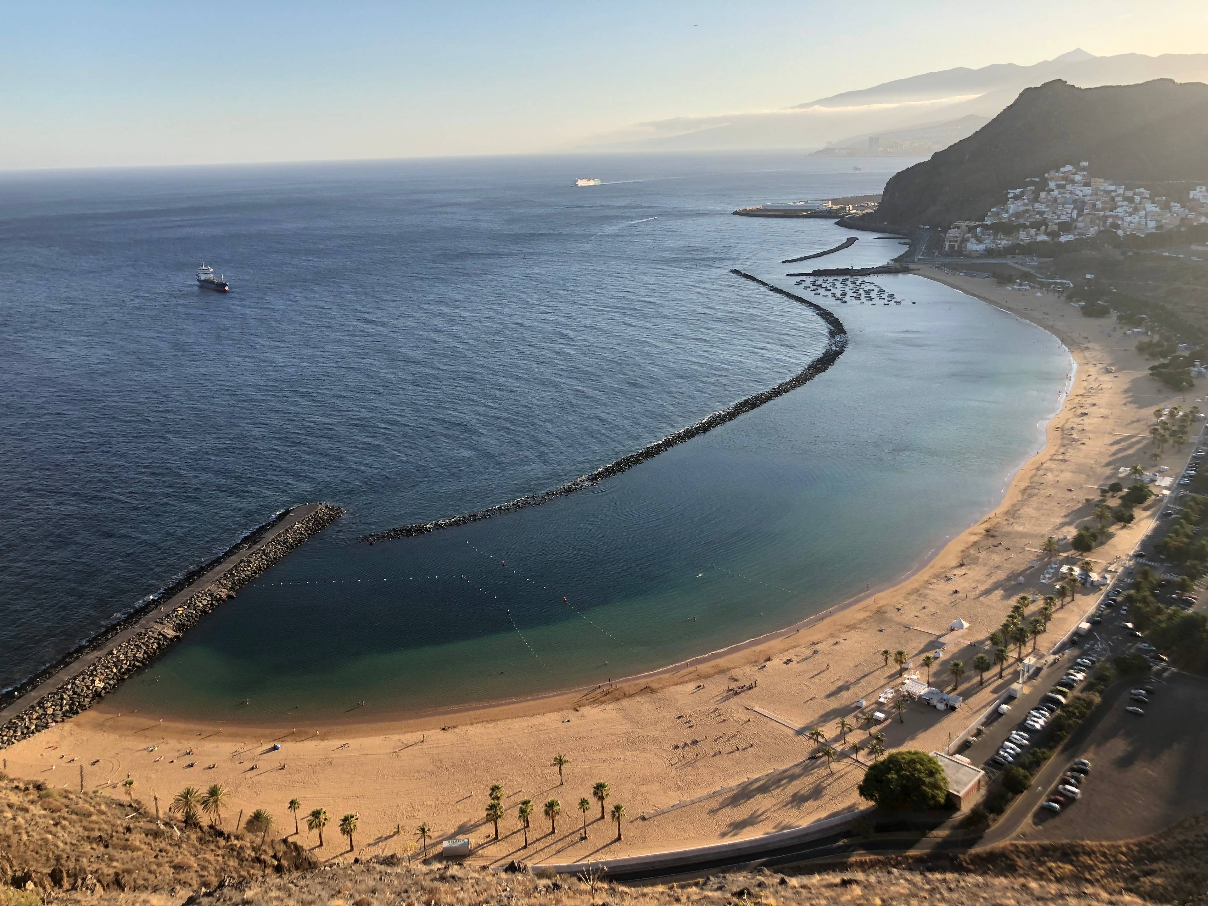 Widok jak z pocztówki lub folderu reklamującego wyspę. Playa de las Teresitas to najpopularniejsza plaża na wyspie. Można na niej zażywać kąpieli wodnych i słonecznych. Woda tutaj jest bardzo spokojna, ze względu na falochrony, które tłumią fale. A plaża na tyle długa, że każdy znajdzie dla siebie miejsce.